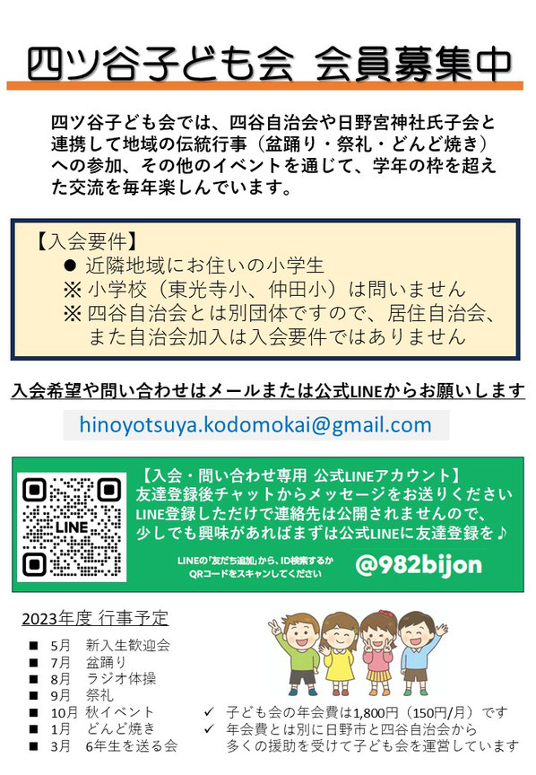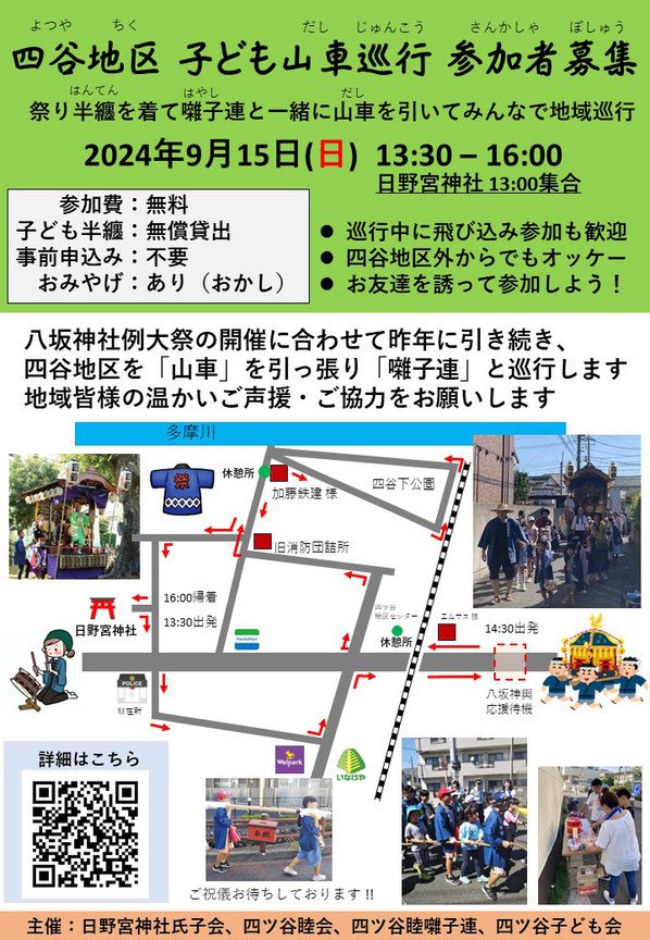 子ども太鼓連では、祭り半纏(はんてん)を着て一緒に子ども太鼓を引いて四谷地区を巡行して頂ける小学生を募集しています。睦囃子(むつみはやし)連と一緒に賑やかに巡行を盛り上げます。参加費は無料で、事前参加登録も必要ありません。巡行中に飛び込み参加もオッケーです。子ども半纏は、四ツ谷子ども会で保有しているものを無償貸出します。四谷地区以外からも参加できますので、是非お友達をお誘いのうえ秋例大祭を盛り上げましょう。また、参加者にはお菓子のお土産も用意しています。
