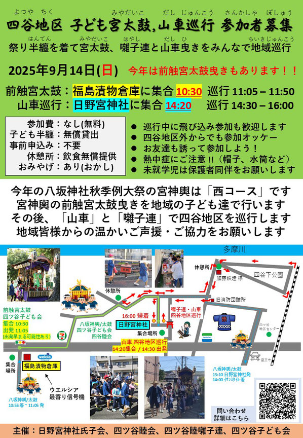また、四谷地区を子ども達で山車を引っ張り「囃子連」とで巡行します。地域皆様の温かいご声援・ご協力をお願いします。