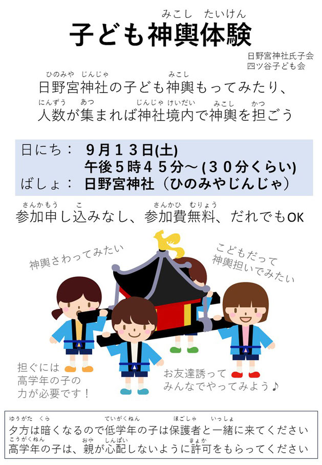 四ツ谷子ども会では一緒に宮太鼓曳き、山車連に参加するお友達を募集します。四谷地区以外からの参加も歓迎します。日野に住む子供たちで地域祭りを是非いっしょに体験しましょう!また、四谷睦会では大人神輿の担ぎ手も募集しています【詳細】。